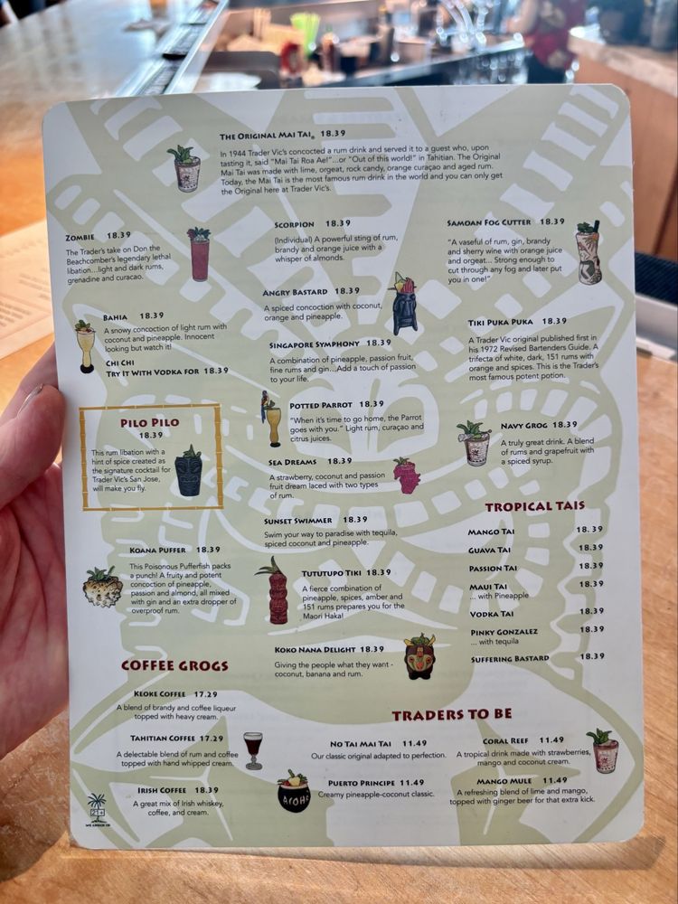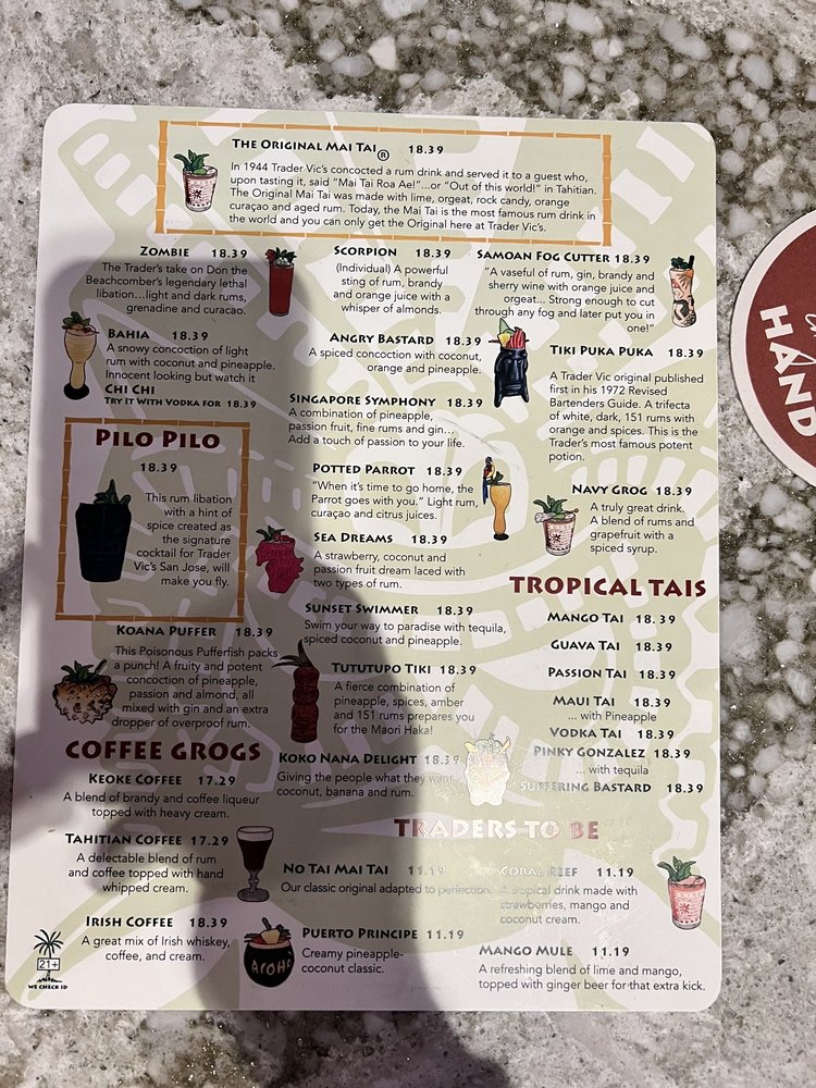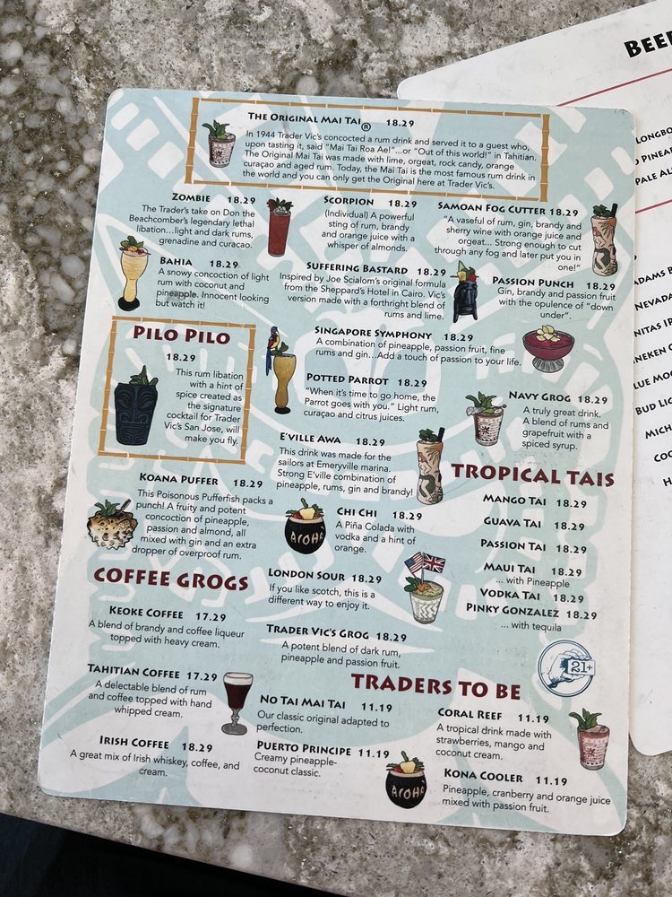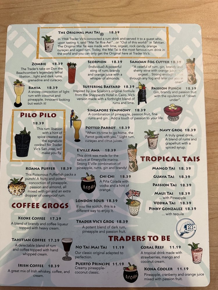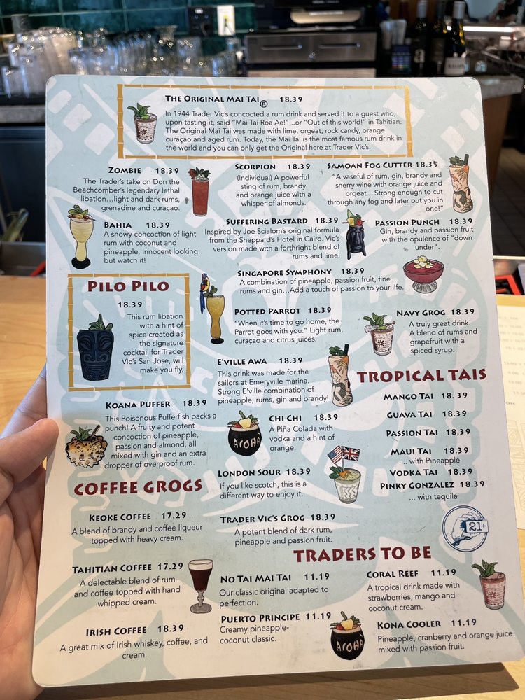 The cocktail selection is equally impressive, with classics like the Navy Grog and Zombie inviting you to indulge in a true tiki experience. Whether you're in for a quick drink, a leisurely meal, or a delightful snack like the Spam Musubi, Trader Vic's promises an unforgettable culinary journey amidst the bustle of airport life.