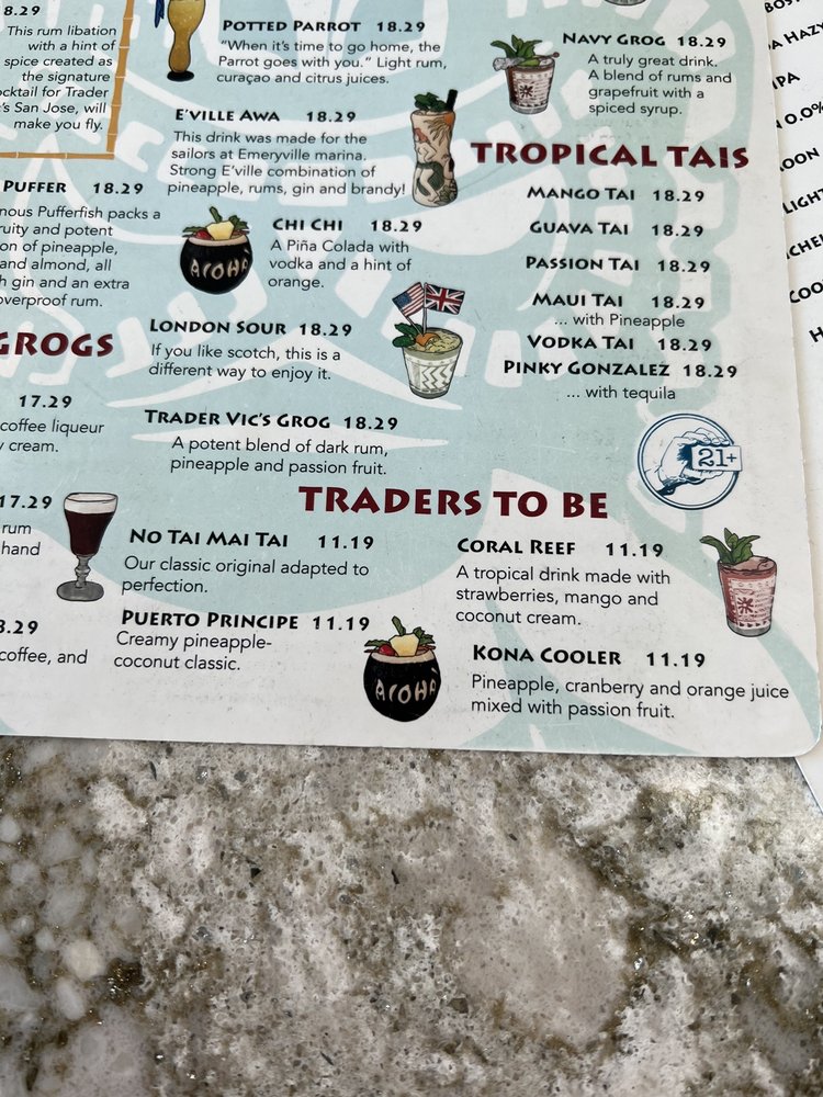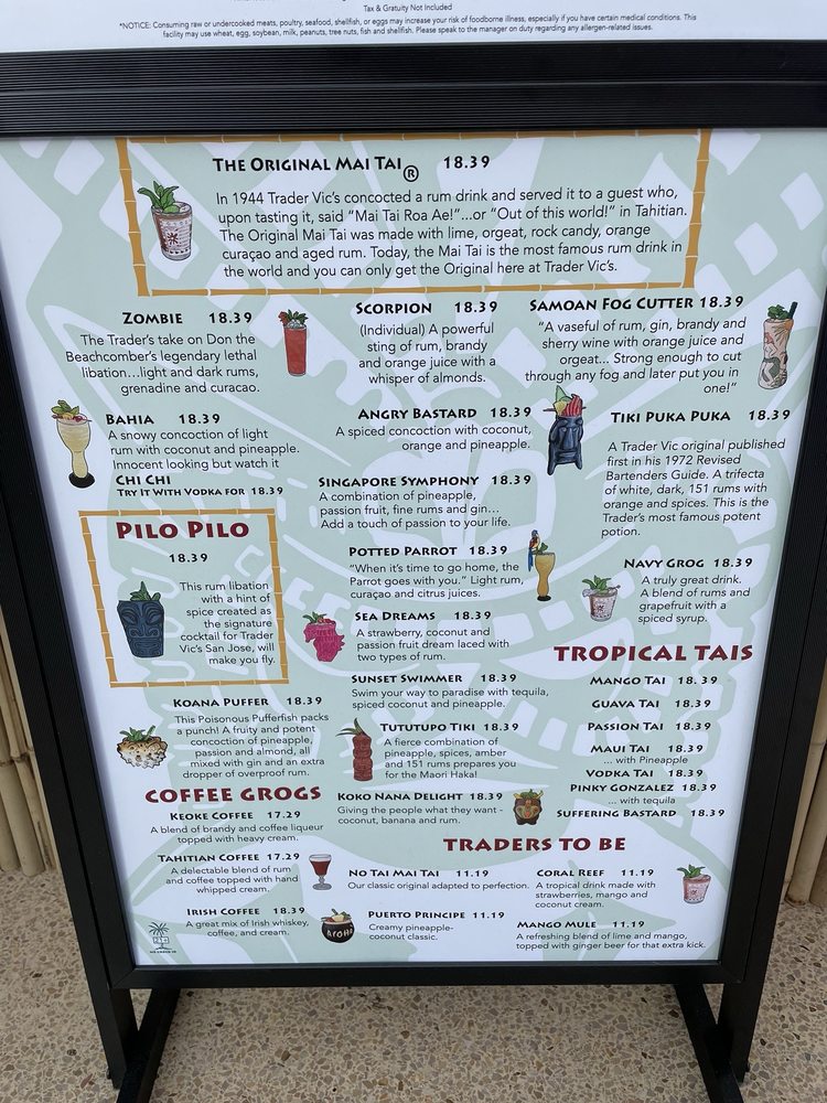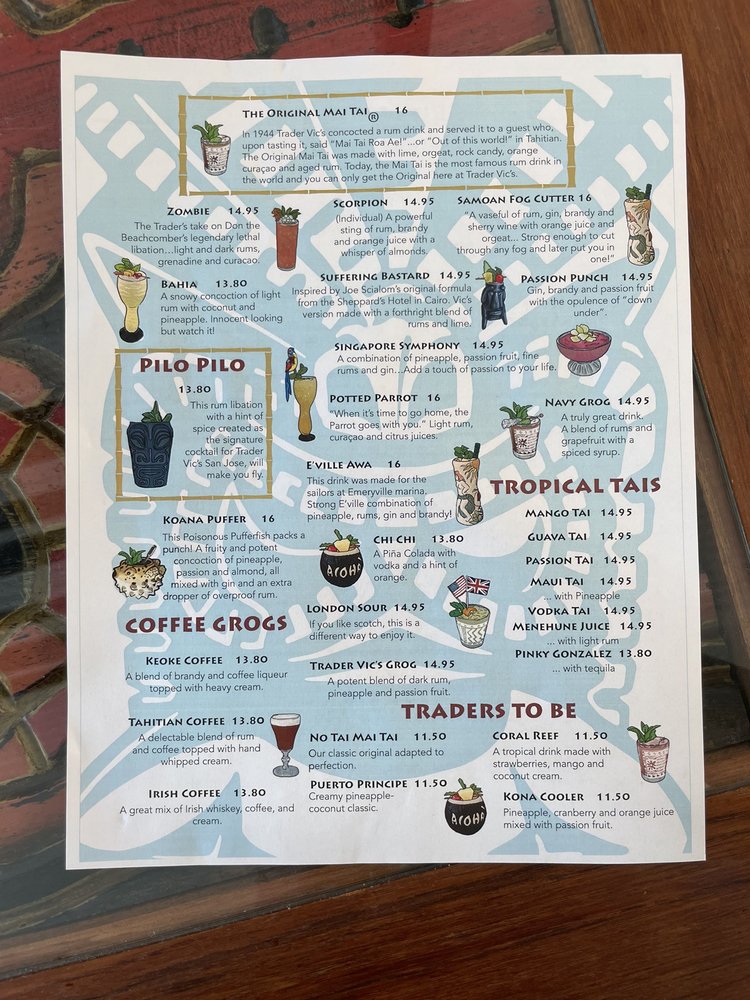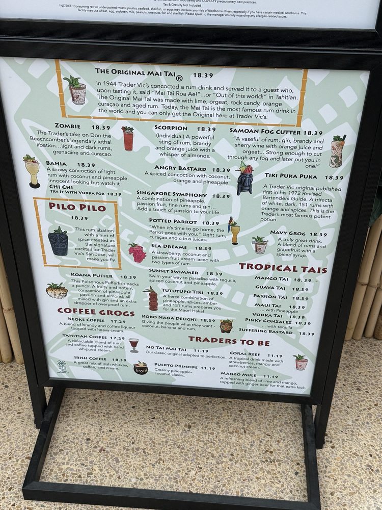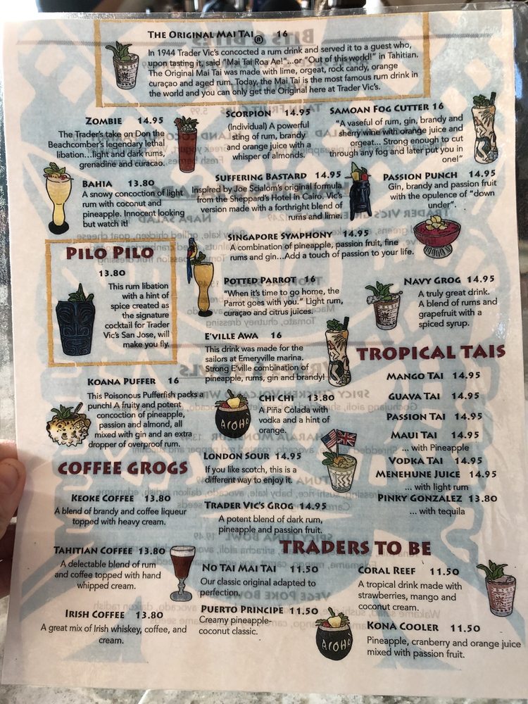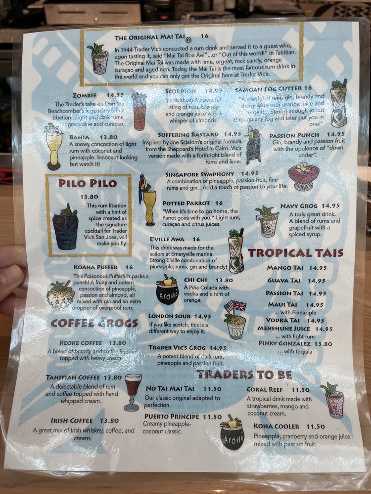 The cocktail selection is equally impressive, with classics like the Navy Grog and Zombie inviting you to indulge in a true tiki experience. Whether you're in for a quick drink, a leisurely meal, or a delightful snack like the Spam Musubi, Trader Vic's promises an unforgettable culinary journey amidst the bustle of airport life.